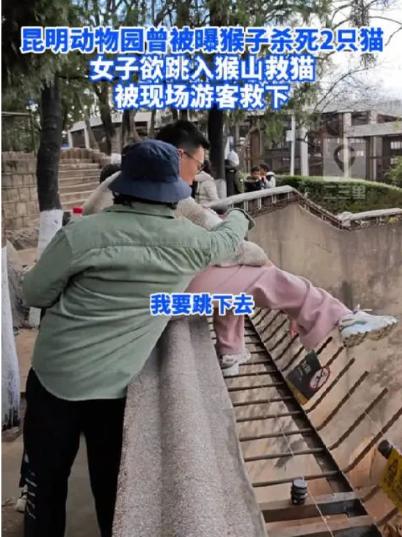 近日,昆明动物园猴山内,2只猫疑似被猴群欺负的视频,在网络传播并引发广泛关注,1月26日,#昆明动物园曾被曝猴子杀死2只猫#话题冲上热搜,很多网友十分关心小猫的健康情况,当天还有情绪激动的爱猫女子欲跳入猴山救猫,被现场游客救下。事情真正受到关注,是从一个热门视频开始的。1月26日下午5点,一个女孩来到昆明动物园。她之前看过消息,这个动物园的猴山,有很多猴子虐猫,小猫很惨。所以决定想办法救小猫。她爬上猴山的栏杆,半个身子挂在上面,歇斯底里地哭喊:“(猴子)欺负猫,强jian猫!我要帮它,我要跳下去!请大家关注这个事情!”周围的游客觉得危险,冲过来拽住了她。  视频传到网上,很快火了。女孩随之出面承认,她在故意把事情闹大。想通过这种行为,让更多人关注到猴山里被虐待的小猫。她成功了。游客发布的视频内容显示,猫和猴子有类似交配行为。视频发布者称,发现在昆明动物园的猴山里有两只猫,看到猴子抓住猫的尾巴交配,猫发出凄厉的惨叫声,“猫生活在这样的环境中很痛苦,希望动物园能解救小猫”。这次“猴子虐猫”事件终于上了热搜。在网友铺天盖地的质疑下,昆明动物园连发了三次情况通报。第一次,园方在通报里描绘了一幅和谐的画面。说这些年来,猴群和猫一直和睦相处,从没发生过互相伤害的现象。  个别猕猴还会给小猫理毛发、抓虱子。大家看到的“猴子虐猫”,只是动物之间正常的嬉戏互动。劝大家理性对待动物之间的共栖相处。这几百字的通报,完全不能平息质疑。网友们纷纷发出连环拷问:公众看到的是群猴霸凌,园方口中却是“嬉戏玩耍”。到底谁瞎?这么个玩耍法儿,换你进去你乐意吗?还有网友翻出国家林草局的一条微博。上面清清楚楚写着,动物园的猴子曾经杀死了两只野猫。——如果真的是一直和谐融洽、嬉戏玩耍,那两只猫是怎么死的?在大量网友的追问下,昆明动物园又发出了第二个通报。这次,他们表示让猫猴共处是专家的意思,做法很科学。并一再强调,猫和猴子的相处很融洽。 最后承诺,为了回应社会关切,他们计划近期把小猫移出猴山。  大家注意,2017年的新闻,说是动物园早期在猴山放了两只野猫。结果这两只猫被猴子搞死了。后来动物园干脆一次性放进7只猫。猫族强大了,猴子才不敢惹猫了。而昆明动物园目前就是两只猫。这两只猫的处境,显然没有园方说的那么好。舆论持续发酵。1月28日凌晨,昆明动物园再次发文。告知网友,已经在安全移出了两只小猫。现在两只小猫的健康状况良好,送给了中国小动物保护协会安置。并且终于改了金口,表示“会认真反思,改进工作中的不足”。很快,小动物保护协会也表示猫已救出。并呈上照片。    两只小猫的状态,看上去真不怎么好。但是它们逃离猴山,也是不幸中的万幸了。还是要感谢一直关注发声的网友。否则,它们的余生,恐怕就要在凌虐中悲惨地度过了吧。而处在这样的绝境又永无救赎的动物,还有多少呢?