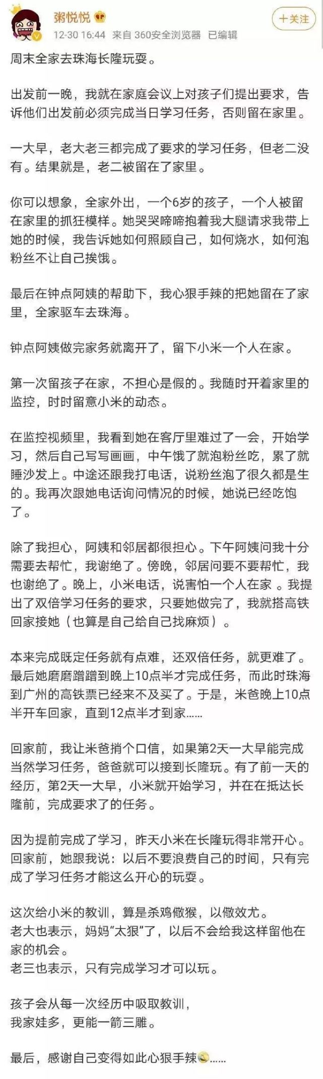 把年仅6岁的女儿自己关在家里,全家出去游玩,拒绝邻居保姆的帮忙,孩子饿了让她自己烧水泡粉丝吃...... 很难想象这是一个心智正常的成年母亲干出来的事。但这确实是一个在微博上拥有百万粉丝的育儿博主分享的自己的育儿经历,一发出,就引起了巨大争议和网友的愤怒。 因为二女儿小米没完成自己给她布置的学习任务,为了惩罚她,这位母亲就做出了让人惊掉下巴的奇葩举动:带着其他两个孩子出去游玩,把6岁的小米独自扔在家里做作业,自己烧水泡粉丝吃。期间,小米多次打电话告诉她:“自己在家里过夜很害怕”、“粉丝怎么泡都泡不熟”,而这位母亲是怎么反应的呢?她提出:你必须完成双倍的学习任务,我才同意让爸爸去接你。到这个时候了,她满脑子想的还是只有让孩子学习。一个6岁孩子,还不具备自立更生的能力,放她一个人在家里,磕到碰到还算小事,万一在烧水的过程中被开水烫到怎么办?万一不小心碰到家里的燃气插座出事怎么办?她把这样的育儿方法分享出来,还觉得自己做得不错,粉丝还一片叫好,当做教育模板,这才是最可怕的。 甚至以孩子叫她“魔鬼妈妈”为荣: 你听话我才会爱你,你学习成绩好我才会爱你,而不是因为你是我的孩子才爱你。这种畸形的爱,父母到底爱的是她的成绩、听话,还是孩子本身呢?说实话,最近一件事情挺触动人的。一个孩子,学习压力太大,从12楼纵身一跃而下。 从来不被爱过,无尽痛苦的学习,永远达不到父母的要求,我想了很久,他之所以敢跳下,是因为他对这个世间没有任何留恋了吧?因材施教四个字,我们从小学就认识,但真正的含义,还得孩子教会我们。“中国家长无法接受自己的孩子将来会是一个普通人,当今社会上很多现象说明,他们看重的不是孩子本身,而是自己的孩子是不是比别人好”。 如果你的孩子,也是普普通通的。也没必要太烦恼。童年本身是一个最神奇的阶段。有了一种对孩子当下生活的尊重,对孩子本身作为人的尊重,我们很多教育方式自然就会变化。所以在一定程度上,教育是一种信仰,一些基本理念的建立,对儿童的基本认识,或者正确的儿童观,是我们教育的一个起点,也是我们整个家庭教育的起点。在安静的时候想想。我的孩子健康、快乐地成长,不就是我一直期待的吗。普普通通的,其实挺好的。这可不是自我安慰,而是一种心态吧。学习是一辈子的事,不是一张纸的事。我们自己都做不到的事情,就不要为难孩子了。