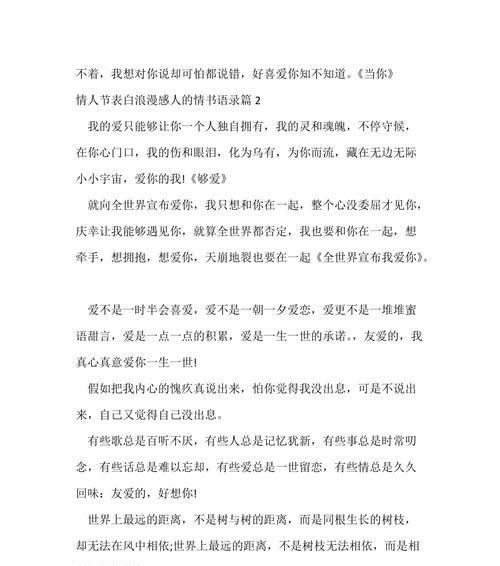 对于一份真挚的感情,表白是必不可少的。而对于男生来说,一份温暖而又感人的情书,往往能够让他们感到更加深刻的情感。下面将为大家介绍如何给男生写一封最感人的表白情书,共分15个。  1.真挚的问候 在情书开头,先向他表达自己对他的问候,语气要温馨真诚,让他感受到你内心的关怀和爱意。  2.坦诚自己的感受 在接下来的中,坦白地表达自己的真实感受,告诉他你多么喜欢他,甚至可以适当地放下一些自己的姿态,让他看到你真实的一面。 3.温柔的称呼  用温柔的称呼如“亲爱的”、“宝贝”等,让他感受到你的爱意和关怀,同时也增强了情书的亲切感。 4.回忆美好时光 回忆你们在一起的美好时光,让他感受到你对于这段关系的重视和珍惜,同时也让他回想起那些美好的时光。 5.表达爱意 在情书中表达自己的爱意,告诉他你多么爱他,让他感受到你的热情和渴望。 6.对他的赞美 赞美他的优点和长处,让他感受到你对于他的欣赏和认可。 7.给予安慰和鼓励 在适当的时候,给予他一些安慰和鼓励,让他感受到你在乎他的感受和情绪。 8.提出自己的愿望 在情书中表达自己对于未来的愿望,让他看到你对于这段关系的坚定和决心。 9.为他祈祷 在情书中表达自己的祝福和祈祷,让他感受到你的关怀和真诚。 10.表达感谢之情 表达自己对于他的感谢之情,让他感受到你对于他的付出和关心。 11.展现自己的幽默感 适当地展现自己的幽默感,让他感受到你的活泼和可爱,同时也增加了情书的趣味性。 12.告诉他你的未来打算 告诉他你对于未来的打算和期望,让他看到你的认真和责任心。 13.对于未来的期待 表达自己对于未来的期待和憧憬,让他感受到你对于这段关系的美好愿景。 14.表达决心 在情书结尾处,表达自己的决心和坚定,让他看到你对于这段关系的执着和决心。 15.表达最后的爱意 在情书结尾处表达自己最深切的爱意,让他感受到你对于他的爱恋和渴望。 一份真挚而又感人的情书,可以让男生感受到你的深情和真诚,同时也能够增加你们之间的感情纽带。在写情书的过程中,要注意语气温馨真诚,用心地表达自己的感受,让他感受到你对于他的爱意和关怀。 |