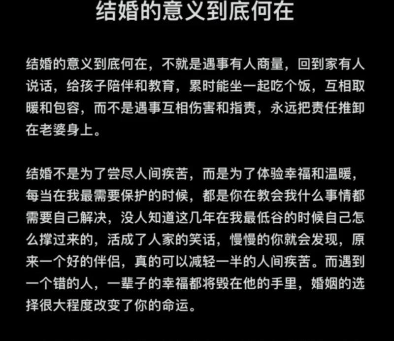 结婚是人生中的一件大事,不同的人有不同的婚姻动机和价值观。有些人是为了爱情而结婚,有些人则是为了稳定而结婚,还有一些人则是被社会压力所迫而结婚。本文旨在探究你的婚姻动机和价值观,从而为你的婚姻做好准备。  理解什么是婚姻动机 每个人结婚的动机不同,可以是为了爱情、家庭、财富、地位等,也可以是将来的规划、想要孩子、经济压力等。婚姻动机是指一个人结婚的动力和目的。 了解你的婚姻价值观 婚姻价值观是指你对待婚姻的态度和想法,包括对婚姻的期望、对婚姻的看法和对伴侣的要求等。你对婚姻的价值观会影响你在婚姻中的行为和决策。  分析你的婚姻动机 了解自己的婚姻动机是非常重要的,只有这样才能明确自己为什么结婚。如果你的婚姻动机是为了爱情,那么你会为对方付出更多;如果你的婚姻动机是为了财富,那么你会更注重家庭的经济状况。 检查你的婚姻动机是否健康 有些人结婚的动机并不健康,比如被父母逼婚、想要逃避自己的问题、想要逃避单身等。这些动机并不利于婚姻的持久和幸福,需要及时纠正。 选择合适的婚姻对象 选择合适的婚姻对象是婚姻成功的关键。在选择婚姻对象时,需要考虑对方的性格、家庭背景、兴趣爱好、职业发展等因素。  沟通是关键 婚姻中的沟通是非常重要的,只有通过沟通才能解决矛盾和问题。需要学会尊重对方的观点、倾听对方的声音和表达自己的意见。 婚姻需要承诺和责任 结婚后需要承担起家庭的责任和义务,需要对家庭和伴侣做出承诺并且认真履行。 忠诚是基础 忠诚是婚姻中的基础,需要保持忠诚和诚实。在婚姻中不要出轨,也不要撒谎。 学会包容和宽容 在婚姻中,需要学会包容和宽容。不要因为小事而争吵或产生误解,要积极解决问题。 调节自己的情绪 在婚姻中,需要学会调节自己的情绪。不要因为一点小事就生气或发脾气,这样会伤害到对方和家庭的感情。 分担家务和责任 婚姻是双方共同经营的事业,需要共同分担家务和责任。不要让一方承担过多的责任,要合理分工合作。 保持良好的沟通 在婚姻中,需要保持良好的沟通。不要让沟通中出现隔阂和误解,要及时表达自己的观点和意见。 学会处理婚姻矛盾 在婚姻中,会遇到各种各样的矛盾和问题。需要学会处理婚姻矛盾,避免因小问题而影响到整个家庭。 学会适应和改变 在婚姻中,需要学会适应和改变。不要固执己见,要为了家庭和对方而做出一些改变和妥协。 婚姻是人生中的一件大事,需要慎重考虑和准备。通过测试自己的婚姻动机和价值观,可以更好地了解自己和伴侣,为婚姻做好准备。希望每一个人都能拥有幸福美满的婚姻生活。 |