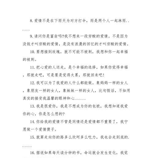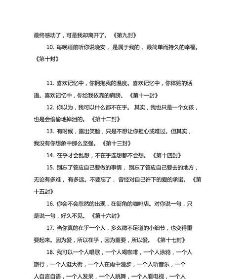 表白是一种勇气和信仰,能够说出口、写出来,需要的是真正的勇气和信仰。有些人在表白时会选择用情书来表达自己的情感,而最感人的表白情书则是能够用真心打动男生的,让他们对你产生强烈的共鸣和回应。  开篇:最美好的梦中情人 用浪漫、柔美的笔调,将自己在梦中遇到的“梦中情人”描述得淋漓尽致,直到最后才揭晓这个“梦中情人”的真实身份就是自己,以此来引起男生的好奇和阅读兴趣。 切入正题:深情告白 直接而真挚地告诉男生自己深深地爱着他,无论是多么微不足道的小事都会让自己心动不已,从而让男生感受到自己爱的深度和强度。  突出特点:独特的性格 通过描述自己独特的性格和喜好,让男生更好地了解自己,从而能够更好地相处和理解。 表达感激:感恩有你 感激男生的出现,让自己重新认识到爱的价值和美好,同时感谢男生给予自己的爱和关怀。 寄托期望:相守一生 表达自己对未来的美好期望和愿望,希望与男生相守一生,共同经历人生中的各种喜怒哀乐。  回忆往事:美好的回忆 回忆起与男生在一起的点点滴滴,一起经历过的美好时光和难忘瞬间,让男生感受到自己对这段感情的珍视和重视。 感性呼唤:心灵相通 通过感性的文字,表达出自己和男生之间的心灵契合和互相理解,让男生感受到自己对他的了解和关注。 承诺永恒:不离不弃 向男生表达出自己不离不弃的决心和承诺,让他感受到自己真正的诚意和信心。 告别过去:放下心结 说出自己放下过去的心结和难以割舍的情感,让男生感受到自己真正的勇气和决心。 展示自信:独立而坚定 表达出自己独立而坚定的性格和追求,让男生感受到自己的自信和魅力。 细腻心思:小细节爱意 通过描述自己对男生的小细节关注和爱意,让男生感受到自己的真心和用心。 切身体验:身临其境 用细腻而生动的笔调,将自己现在的心情和情感状态描述得淋漓尽致,让男生感受到自己身临其境的感觉。 点滴积累:真心相处 用自己的亲身经历,告诉男生相处的点滴积累是实现真正幸福的关键所在,从而鼓励男生与自己一起共同努力。 表露期望:等待回应 向男生表达出自己等待他的回应和选择,希望他能够认真考虑和回应自己的爱。 用真心打动 最感人的表白情书是用真心打动男生的,无论是文字、语言还是行动,都需要真正的勇气和信仰,才能够让男生感受到自己的爱。 |
