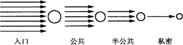 物质环境中从公共部分到私密部分的空间序列。建筑理论家亚历山大提出。总是按公共→半公共(半私密)→私密的顺序排列(见下图)。如一幢办公楼,总是先门厅、咖啡座,再是接待室、办公室,最后是密室。依赖于物质环境的设计和空间序列的安排,在空间关系上保证使用者对私密性的要求,使其心理在公共性和私密性之间取得平衡。