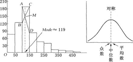 描述统计量的一种。反映一组数据的集中趋势。一组数据中重复次数最多的那个数,常记为M0。对于未分组资料,将数据组排序后直接观察得出。对于分组资料,可由M0=LMc+ W计算得出。式中LMc是众数所在组的下限,d1是众数所在组次数减去相邻的下端组次数,d2是众数所在组次数减去相邻的上端组次数,W是众数所在组的组距。对于分组资料也可用图解法近似求得M0(见左下图)。图解法需要首先作出数据组的次数直方图,然后找到最高的一个直方条(对应于次数最多的组),按图连接线段AD、BC,它们交点是M,过M作横坐标轴的垂线(虚线者),与横坐标轴的交点便是众数的近似值。有的数据组可能出现多个众数,即它们均有相同的最高次数。众数的优点:(1)适用定量资料与定性资料;(2)对极端值不敏感,即不会受到极端值太大的影响;(3)适用含有开口组的分组资料。众数在对称分布与偏态分布中与平均数、中位数的位置关系(见右下图和下页图)。
