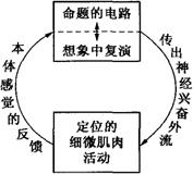 对想象训练效果的一种神经肌肉解释。源于美国学者W.B.卡彭特1894年在《心理训练的原则》中提出的想象的观念运动原则。该原则认为,想象训练能促进运动技能的学习是由于想象过程激起细微的神经肌肉活动的模式,这种模式由观念引起,比实际做该动作时的活动量小,但反映外显的身体活动的模式。神经肌肉活动反映实际的身体活动时,它是定位的,为头脑中的动作图式(命题的电路)提供反馈,这种反馈可用作认知上的比较和纠正动作反应,或为下一个动作作好准备。该假说中的重要变量是本体感觉的反馈,即在想象中复演动作的结果。该假说认为,在与命题的电路相联系进行想象时(见图中上方方框),主体从长时记忆中回忆起某一运动技能,想象活动使传出神经的兴奋外流到实际做该动作时所使用的肌肉群上(图中右侧箭头)。尽管在想象中复演动作时,传出神经的活动量比实际做该动作技能时小,但它定位在与该技能有关的肌肉群上(见图中下方方框)。当引起细微的肌肉神经兴奋时,这一神经兴奋又被本体感觉的反馈送回到命题的电路上(图中左侧箭头)。但反馈的信息是用来纠正以后的动作,以及在命题的电路中得到强化。由于伴随想象而产生的肌肉神经兴奋作用的定位问题以及想象中复演动作的有效性未得到充分证实,该假设遭到一些研究者的反对。