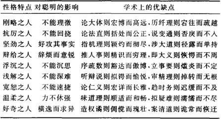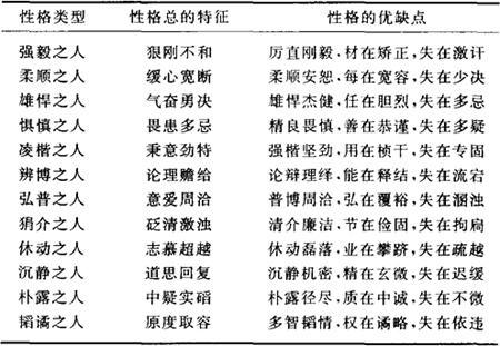 三国魏刘劭关于性格类型问题的主张。有三种观点:(1)五类型说。在《人物志·九征》篇中,从五行观出发,认为五行的特征各自显现在人体上,成为“五体”;有了这五种形体,又产生出五种性格特征,称为“五质”;这五种品质具有永恒不变的性质,因此又叫做“五常”或“五德”。这样就把性格划分为以五行为基础的五种类型(见表1)。(2)九类型说。在《人物志·材理》篇中,分析了九种性格对聪明(智力)的制约情况,从而显示出九种性格类型的基本特征(见表2)。(3)十二类型说。在《人物志·体别》篇中,又把性格区分为十二种类型,并对每一种类型的基本特征、优缺点,进行了详尽而深入的剖析(见表3)。 表1