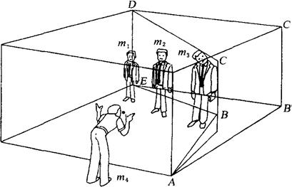 视错觉研究实验。美国心理学家A.埃姆斯制作。他1948年在普林斯顿大学设计建造了一间房屋(见图)。要求观察者m4透过窥视孔用单眼观察屋内的情形,m4看到的是一个形状正常的房间,房间后墙边站着看上去身高差异很大的三个人m1,m2,m3。事实上,室内墙壁的高度是不相等的,后墙(即图中的BCDE)是一面倾斜度很大的墙,而主观感觉后墙是B′C′DE;屋内靠后墙站着的三个人的身高是完全相等的,但由于后墙是斜的,BC的距离小于ED的距离,观察者m4离m3较近,而离m1较远,所以看上去m3要比m1高得多。人的深度知觉要通过双眼观察才能获得。该实验中,观察者用单眼观察屋内对象,于是产生了错觉。