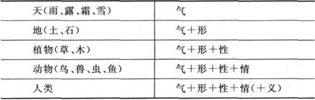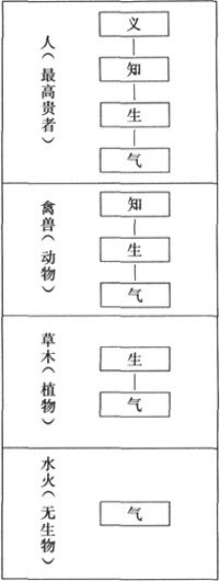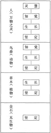 关于心理种系发展问题的一种观点。提出并对此有研究的思想家是荀子、王逵和刘智。《荀子·王制篇》:“水火有气而无生,草木有生而无知,禽兽有知而无义;人有气、有生、有知亦且有义,故最为天下贵也。”明王逵《蠡海集》:“天赋气,气之质无性情,雨、露、霜、雪,无性情者也。地赋形,形之质有性而无情,草、木、土、石,无情者也。天地交,则气形具,气形具,则性情备焉,鸟、兽、虫、鱼,性情备者也。鸟兽虫鱼之涎、涕、汗、泪,得天之气;鸟兽虫鱼之羽、毛、鳞、甲,得地之形,岂非其气形具而备性情乎?”刘智《天方性理》卷一:“性者何也?性则其灵觉也,称其灵觉以别于物也……人之性有生长、有知觉、有灵慧,得其性之全。鸟兽之性有生长、有知觉、无灵慧,草木之性仅有生长,而金石之性仅有坚定而已。”三人均考察了人同物的区别,论述心理(性)从简单到复杂、从低级到高级的发展过程,并表现为自然发展的一定阶梯(见图)。
