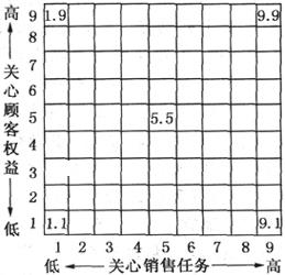 美国学者R.R.布莱克和J.S.莫顿提出的推销理论和方法。他们认为,推销行为有两个倾向:一是倾向于完成销售任务,二是倾向于关心顾客的利益。这两种倾向构成推销方格模式(见图)。有五种类型:(1)1.1型,即事不关己型。对销售任务和顾客利益都不关心。(2)1.9型,即顾客导向型。十分重视与顾客建立友好关系,认为做生意要顺应顾客心意。(3)9.1型,即强销导向型。只关心如何增加销售额,忽视顾客权益,“成就欲”高,积极向顾客推销商品,还可能向顾客施加压力。(4)5.5型,即推销技巧导向型。不一味取悦顾客或强销,自觉掌握推销技巧,若与顾客有矛盾,则采取折衷态度,以期完成销售任务。(5)9.9型,即解决问题导向型。对顾客利益和销售任务均高度关心,研究顾客心理,通过推销商品或服务为顾客解决问题,由此完成销售任务。