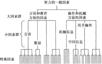 一种智力结构理论。英国心理学家弗农20世纪60年代提出。认为智力不是由彼此无关的群因素构成,也不是立体三维结构,而是一个按层次结构排列的心理结构。他把智力分为4个层次(如下图所示):最高层次是智力的一般因素G;第二层次为大因素群,分两大群,即言语和教育方面的因素及操作和机械方面的因素;第三层为小因素群,包括言语、数量、机械信息、空间信息、动手操作等;第四层为特殊因素S,即各种各样的特殊能力。该理论是对斯皮尔曼G因素论的继承和发展,在斯皮尔曼的G因素和S因素之间增加了大因素群和小因素群,从而明显改变了把一般因素和特殊因素相对立的局面。