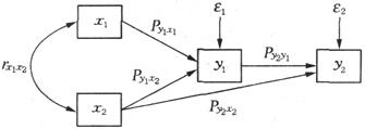 路径分析术语。由相关的外生变量产生的效应。在下面的路径图中,x1与x2是相关的外生变量,y1和y2是内生变量(均已标准化),y1与x2间的相关系数ry1x11=Py1x2+Px1rx,其中第一项是直接效应,第二项是未分解效应。