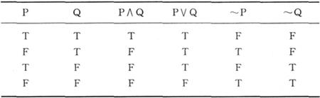 描述简单判断组合成的各种复杂判断之“真”、“假”情况的表格形式(见下图)。在逻辑学中,若一个判断是正确的,则称这个判断为“真”,用符号T表示;若一个判断是不正确的,则称这个判断为“假”,用符号F表示。用一些逻辑操作,如“与”(∧)、“或”(∨)、“非”(~)等,可将简单的判断构成各种复杂的判断。这些复杂判断的正确性是由组成它们的简单判断决定的。如,假设有两个简单判断P和Q,则:(1)只有当P和Q都为真时,复杂判断“P∧Q”才为真,否则“P∧Q”为假;(2)只要P和Q有一个为真,复杂判断“P∨Q”就为真,否则“PVQ”为假;(3)操作“非”是取反,即P为真时,则“~P”为假,而P为假时,则“~P”为真。