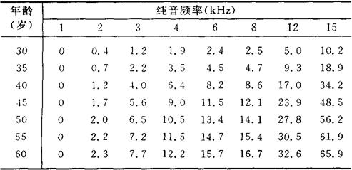 老年心理学术语。因年龄关系而导致的听力损失现象。下表为欧洲国家统计的不同年龄人群平均听力随年龄增长而损失的情况(以25岁青年听阈为标准)。从表中可见,高频率的听力损失随年龄增长而迅速增加。