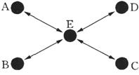 小群体信息交流模型。其形态如图。美国心理学家莱维特在五人群体双向交流实验中发现。认为处于中心位置的E拥有独占沟通渠道的特权,很可能是群体的领导人或核心人物。其他人员A、B、C、D由于相互间的沟通受到限制,满足感较低。传递信息的速度较快,能提高简单工作的效率,对于复杂难办的工作,成效不高。