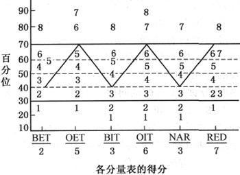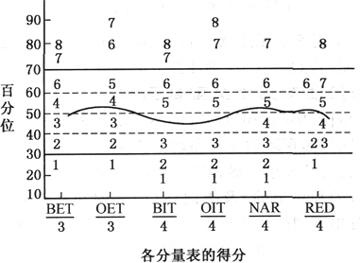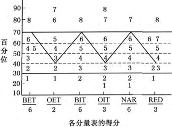 显示运动员不同注意类型的图示。不同的体育运动项目和动作技能对运动员的注意范围和注意指向性要求不尽相同。运动心理学家根据注意的范围(广阔的和狭窄的)及指向性(内部的和外部的)两个维度,划分出不同的注意集中类型:(1)广阔的内部集中注意;(2)广阔的外部集中注意;(3)狭窄的内部集中注意;(4)狭窄的外部集中注意。许多运动项目要求运动员具有既广阔又狭窄的注意集中,且有时需要指向内部,有时需要指向外部。美国运动心理学者奈德弗1976年根据以下6个分量表编制测定注意集中类型的量表(TAIS):(1)广阔外部注意(BET);(2)外部刺激超量(OET);(3)广阔内部注意(BIT);(4)内部刺激超量(OIT);(5)狭窄有效注意(NAR);(6)未能顾及重要线索而出错的注意集中(RED)。其中,第(1)、(3)、(5)种属积极的注意集中类型,第(2)、(4)、(6)种属消极的注意集中类型。将通过问卷测定获得的这六种注意集中类型得分联系起来,可构成几种剖面图,如,图1为有效注意类型剖面图,图2为效率不高注意类型剖面图,图3为“平常”注意类型剖面图。还可构成内心负担过多剖面图、外界分心剖面图,以及高度焦虑不安和过分内部集中剖面图等。优秀运动员注意集中特点符合有效注意类型剖面图。