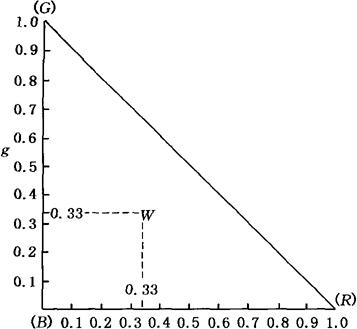 亦称“颜色三角”。颜色标定技术。麦克斯韦最早提出。基本形状为一等腰直角三角形。三个顶角分别代表红、绿、蓝三种基色(分别标识为R、G、B)。r和g分别为等腰直角三角形的两直角边,代表R和G在三种基色中的相对比例。b表示B在三种基色中的相对比例,由b=1-(r+g)计算得到。如标准白光的色度坐标为W(0.33,0.33),因为标准白色由三原色光等值相加(即b+r+g=1且b=r=g)而成。这种标定技术的基本原理1931年被国际照明委员会(CIE)吸收并改进为国际照明委员会色度图。参见“色度图”。