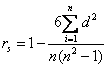 s为等级相关系数,d为每两个对应等级之差数,n为成对数据的个数。等级相关适用十小样本的测量数据(一般在10~30之间)的相关分析。如果等级相同的量数过多时,则根据等级所得的结果过大,不如用积差法求得结果精确。