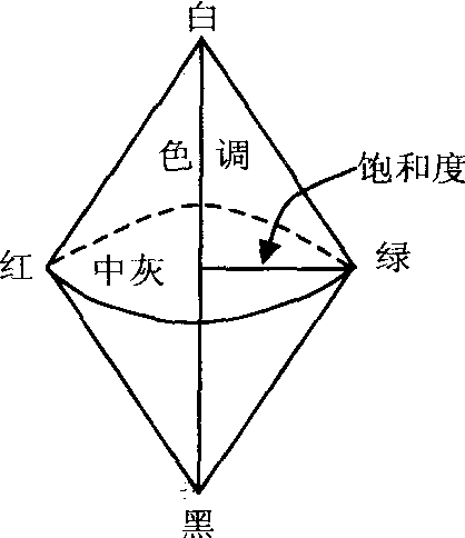 用来表示颜色的色调、饱和度和明度相互关系的一种模型。它由两个底面重合的圆锥体组成(如下图)。