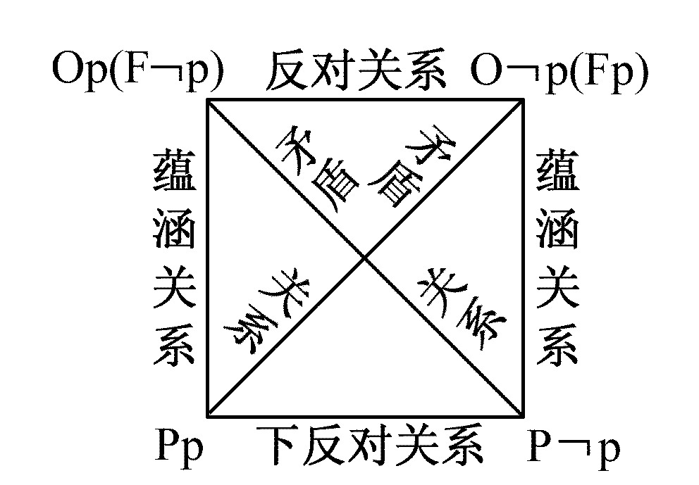 规范命题的对当关系 opposition of deontic proposition 简单规范命题之间类似传统逻辑中性质判断的对当关系那样的推演关系。在现代规范逻辑中,主要有三种规范命题:必须命题(Op)、禁止命题(Fp)、允许命题(Pp)。而这三种命题又都可以或者是肯定的(这里的“肯定”表示做某件事,或采取某行动),或者是否定的(这里的“否定”表示不做某件事,或不采取某行动),按此,规范命题又相应可分为六种。即(1)必须肯定命题(“必须p”,符号表示为:Op);(2)必须否定命题(“必须非p”,符号表示为:Op);(3)禁止肯定命题(“禁止p”,符号表示为:Fp);(4)禁止否定命题(“禁止非p”,符号表示为Fp);(5)允许肯定命题(“允许p”,符号表示为:Pp);(6)允许否定命题(“允许非p”,符号表示为Pp)。在这六种命题中,由于“禁止p”(Fp)同“必须非p”(Op)、“禁止非p”(Fp)同“必须p”(Op)其规范要求是相等的,因此,我们就可以分别用“必须p”、“必须非p”来表示“禁止非p”与“禁止p”,这样,前述六种命题就可主要归结为四种:必须p(Op),必须非p(Op),允许p(Pp),允许非p(Pp)。这四种规范命题之间存在着类似传统逻辑中A、E、I、O四种性质判断之间的那种对当关系,因而,也可以借助于下述逻辑方阵来表示。 .JPG) (1)Op与O p之间是反对关系。如果Op是正确的,则O p是错误的。如果O p是正确的,则Op是错误的。但Op与O p可以同是错误的。(2)Op与P p之间,O p与Pp之间是矛盾关系。如果Op是正确的,则P p是错误的;如果Op是错误的,则P p是正确的;如果P p是正确的,则Op是错误的;如果P p是错误的,则Op是正确的。O p与Pp之间也具有同样的关系。(3)Op与Pp之间,O p与P p之间是蕴涵关系。如果Op是正确的,则Pp也是正确的;如果Op是错误的,则Pp对错不定;如果Pp是错误的,则Op也是错误的;如果Pp是正确的,则Op对错不定。O p与P p之间也具有同样的关系。(4)Pp与P p之间是下反对关系。如果Pp是错误的,则P p是正确的;如果P p是错误的,则Pp是正确的。但Pp与P p可以同是正确的。 |