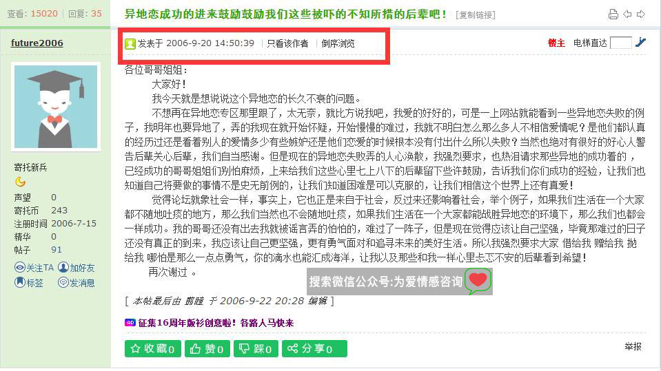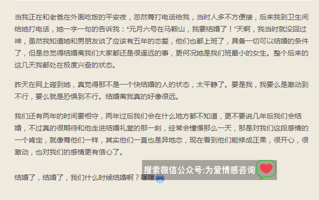 内容 | ![]() 异地恋很多成功的案例,最终走到一起,组建家庭,选一城,白头偕老的案例数不胜数: 异地恋真的更难以维持吗?研究显示,答案是否定的。 参考数据:情侣之间存在着更加亲密的关系 1、匹配程度 2、满意程度 3、亲密程度 4、信任程度 5、忠诚程度 数据调查显示,“异地恋”和“近距离恋爱”,除同居之外,从感受上几乎没有差别。 并且,比起近距离恋爱,异地恋并不会有更高的分手几率,在普度大学的一项研究中,异地恋的分手率和非异地恋的分手率为27%和30%,没有显著差异,甚至异地恋的分手率还要略低一些。 1、我有三位非常要好的异性朋友,其中有两位是异地恋,不但异地恋,而且网恋,女孩子在重庆,男孩子都远在东部城市,三年了,这两对感情非常好,已经到了见父母定终身的程度了。 2、大学一位关系很好的异性朋友,她和他男友大学之后就分隔两地,男方在北京读研,女方去了新加坡。我笑他们是跨国恋,一年也见不了两次。如今,他们已经非常幸福地结婚了。为庆祝他们的婚姻我还录制了一段视频。 3、同样是大学里面的一对,毕业后,男方留在了本校,女方到了北京,如今他们异地已经四年了,感情依旧如故。 这位姑娘在感叹异地恋居然会成功(有啥好感叹的,例子多着呢): ![]() 提及一个异地恋: ![]() 异地五年:异地六年:网恋加异地恋: ![]() 异地恋成功率是多少???怎么提高呢?涉及多少方面?方面太多下面列举一些: ![]()