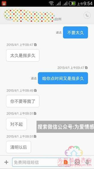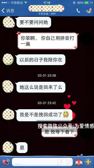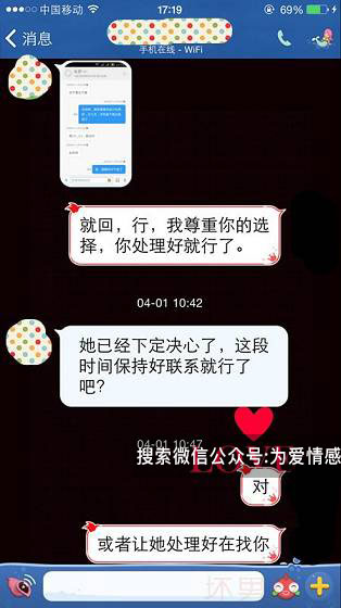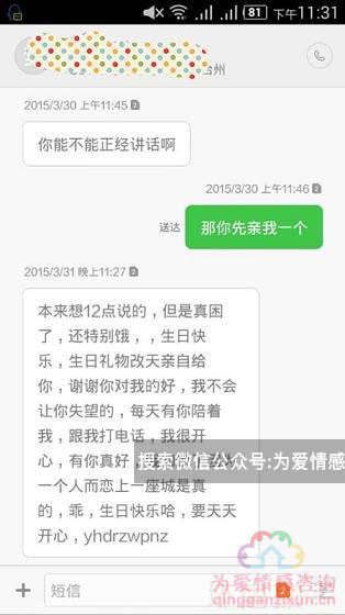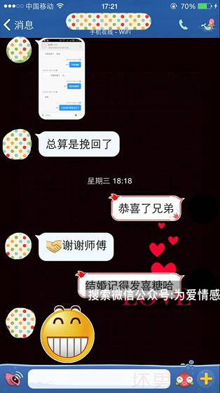内容 | ![]() ![]() 异地恋挽回女友成功案例 经本人同意发布照片 这是一个真实的过程记述,仔细阅读,不要错过任何一个细节,也许这些能帮助到你,得到了你想要的效果,即使你没有像我咨询,我的分享也帮助了大众。 我们直接进入场景,小刚说: 由于是异地恋,又忙着创业,感觉女朋友每天给我打那么长时间的电话很烦。身边有个好朋友,他和她女朋友也是异地恋,他女朋友联系他的时候,他总是用不了两三句就把电话挂了,很是羡慕他。一天早上,她突然给我发了个短信,说对我没感觉了…… 挽回案例回放: 我和我目标是异地恋,2013年大学我们在一个学校,我们是很好的朋友,我能感觉到我们都互相喜欢着对方,毕业后我为了梦想,要去另一个省,目标因为我也选择了这个省但是我们不在一个城市。 9月份毕业,我们每天都通电话,10月份她来找我玩的时候,我强吻了她,她就成了我的女朋友,这期间我们关系一直很好,每天都要打两三个小时的电话,虽然有时候会吵吵小架,但是从来没说过分手。 我们一直视对方为结婚对象,我自己在学校主要是创业,2014年下半年,我的生意一下子好了起来,从早忙到晚,我在忙的时候,女朋友给我打电话我总是很不耐烦,感觉每天打那么长时间的电话很烦。 后来她就只有每天晚上给我打电话了,我感觉这样挺好的,我有自己的时间做自己的事情了,但是这期间我们经常因为这个吵架,她总是认为我没有以前爱她了,期间我们分手了一次,但是第二天她给我打电话说她分手后她很伤心,她朋友说她像蔫了的花朵。 她这样给我说我一下就心疼她了,我和她和好了,但是好景不长我们一直闹分手,每次分手我都不是真心和她分手,只是希望她改一改她身上的小毛病,给我点独立时间。 这期间我也降低了自己的姿态,每次做什么都听她的,在这期间我赚到了一点小钱,因为女朋友比较能花钱,家里给她的钱不够她花,女朋友买手机,买衣服,买包等等很多都是我给她买的,不是我不够爱她,只是没有时间陪她了。 身边有个好朋友,他和她女朋友也是异地恋,他女朋友联系他的时候,他总是用不了两三句就把电话挂了。很是羡慕他,感觉我女朋友太粘人了,所以我在打电话给我女朋友时候就更不想和她说话了,后来假期到了,她要先回老家,我还要在这边再呆两周,回家前我们还好好的。 回家后打电话就贵了,我就以这个理由经常不联系她,可是就在这期间有个男的是我女朋友的同事吧,每天给我女朋友打电话,而且他们很能聊的来,可能平时他们关系都比较好。 她回家后有一天早上,她突然给我发了个短信,说对我没感觉了,在一起没话说。然后我就很生气和她说分手,当时也有想过以后不再联系了。然后把她QQ也拉黑了。 ![]() 晚上我忙完以后想给她和好,可是我发现我女朋友和一个男的空间已经互相留言我爱你了。 那时候自己都蒙了,不敢相信这一切,然后我电话打给我女朋友,我给她说了好多好多话,给她说我如何爱她,逼她和那个男的分手。 我没控制好自己的情绪,她也哭了,但是她也不知道该如何选择。然后我就给她闺密打电话,让她劝劝我女朋友。 第二天我就马上买票回家了,这期间我给她打电话约她出来,可能我太情绪化了,她不愿意出来。 后来她生日那天,我通过她妹妹知道了她在哪里唱歌,我就带着生日蛋糕去了,可能因为我的突然来到我女朋友很抵触,我厚着脸皮呆了下来。然后我唱了一首回来我的爱,我女朋友哭了,但是她对我说她不爱我了,就是和那个男的分手我们也不可能了!当时就心碎了死的心都有了。 后来,我就在网上学习如何挽回,看了很多贴子,后来在情感咨询网站上,找到了老师:挽回顾问团队,本来我不太相信网上的什么恋爱挽回机构的,因为我没有见过生活中有类似的职业。 当时就抱着被骗我也要试一试的心态,因为我很爱我的女朋友,是把当成将来的老婆看待的。 选择团队的服务后,首先和我通了电话,把整个事情的前因后果以及解决的方向告诉了我,我当时听了心里就有了一点底气。分手后我的心里状态很不稳定,反复纠结,我真的太害怕失去她了,而且我还怕她和那个男的在一起时间久了有了感情。 给我说,我们是有感情基础的,只是因为我不关心她,以及我的紧逼造成了她现在这种带有报复式的分手。我们的策略要着重在沟通方式和浪漫感动方面发展。 让我把我们在一起拍的照片还有QQ上的聊天记录发给他, 帮我做了一本书,我又加了一些我和女朋友在一起时候的一些比较感动的事和感悟。这本书邮寄给我女朋友后,她哭了,她说这是她这辈子收到的最美好的礼物。但因为这时候快过年了,约不出来。这段时间只能通过聊天继续下去。需要类似挽回方案细节的朋友可以添加QQ 微信 ![]() ![]() 由于我暂时端正不了心态,刚开始是 帮我代聊的。通过 的代聊和以及自己的提升,时间每过一天,我感觉我目标对我的好感就多一点,从最开始的讨厌,到最后给我认错,再到最后请求我放纵她一回, 给我说一定不能逼她,要慢慢来。 因为异地恋她也是那种比较粘人的女生,知道在我这里得不到我对她的关心,但是她也知道她最好的结婚对象是我不是那个男的。因为找到的时候已经快过年了,过完年就在家里呆的时间不多, 的提议是,好感信号足够,可以在年后约见面。 ![]() 约了三次才把她约出来,前两次她不是说有事就是临时放鸽子,师傅说她这是因为内心纠结