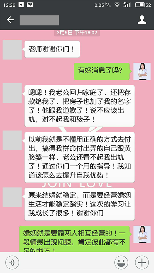 ? ? ? 董小姐找到我们的时候,自己也是非常茫然的,自己怀着孩子,既不想家散了,让孩子在破碎家庭环境下长大,又难以原谅老公婆婆这种行为。通过我们的疏导,先是让她的情绪稳定住,并且通过分析利弊让她明白自己需要做的事情,在我们团队通力合作,以及半年的耐心陪伴下,终于让丈夫归心,且让自己舒心了。