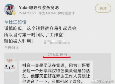 有网友整理杜江语音事件时间线,演员杜江被曝私聊网友,让其私信对话保密,工作室澄清是在做活动。杜江工作室解释“私信女网红”事件:账号是员工管理,发语音是工作2月3日,杜江与一美女私信聊天,并叮嘱女方私信保密。 2月10日,网友投稿给娱乐博主。2月11日早上8点多,杜江发某音视频“请把武汉好吃好玩和健身的地方发给我吧!” 2月11日上午10点44分,粉丝私信询问工作室,杜江工作室回应称某音是团队在管理,因为杜江要分享武汉特色美食健身的活动,语音也是工作人员发的。2月14日傍晚18点51分,霍思燕发布情人节吹玫瑰花飞吻的视频,并配乐《慢慢喜欢你》,大秀恩爱。 2月14日晚上22点59分,有博主开始曝光杜江与美女的聊天记录截图。2月14日晚上23点21分,杜江粉丝团开始发微博晒杜江于2月11日10点44分的回复截图。 网传杜江工作室也给出了回应,光看私信也没有过火的东西,但是大多数观众表示不信。 真是给情人节送了个大礼。 ?