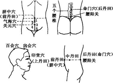 气功功法练习的主要穴位。在小腹脐下一寸三分处,即关元穴位。有三丹田之说:上丹田在印堂,下丹田在关元,中丹田在腰阳穴。也有前丹田(脐中穴)、中丹田(腰阳穴)和后丹田(命门穴)之称(如图)。中国古代医学认为,肾为先天之本,五脏之根。《难经》云:“两肾者非皆肾也,其左为肾,右者为命门。”命门为脏腑活动的动力,气功练习能控制丹田,包括命门(即后丹田)。丹田是机体身心能量调拨、储备的中心机制,生理心理活动的基础部位。《石室秘录》:“心得命门而神明有主,肝得命门而谋虑,胆得命门而决断,肺得命门而治节,大肠得命门而传导,小肠得命门而布化,肾得命门而作强,三焦得命门而决渎,膀胱得命门而收藏”。丹田的气功练习不仅可控制全身脏腑枢纽,使人精力充沛,支配机体作出有效反应,且可调整优化心态,使思路畅通,避免错节丛生并根治各种身心障碍。运动心理训练中,可利用丹田穴位进行注意焦点集中训练,排除内外干扰。