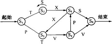 状态限定语法图解 (从入口开始沿着箭头所示任何方向到达出口的字母串都是合法的,例如:(1)T[S]XS (2)T[S]XX[[T]VPX]VV (3)T[S]XX[[T]VPX]VPS (4)P[[T]VPX]VV (5)P[[T]VPX]VPS |