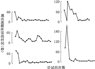 美国心理学家桑代克为研究动物的学习即问题解决过程而进行的实验。在一典型的实验中,将一只饿猫放入迷箱中,猫可从箱内看到箱外的食物。为逃出迷箱、获取箱外食物,猫必须学会触动箱内的某种特殊装置,如按压踏板或拉动绳线,使箱门打开。猫最初在箱内表现出乱跳、撕咬栏杆、碰撞箱壁等盲目、尝试性的无关动作,偶尔碰到踏板或拉动绳子而打开箱门,得到箱外食物。通过多次反复实验,动物逐步减少了盲目、随机、无效的动作,最后一被放入箱内即能很快触动装置把门打开。桑代克记录下每次实验中猫逃出迷箱所用的时间,即猫作出正确反应的潜伏期。如以纵轴表示成功反应所需的时间,横轴表示连续尝试的次数(即实验次数),则可得到学习曲线(见图)。依据实验结果,桑代克认为动物的学习是一个渐进的、盲目尝试而逐步减少错误的过程,是建立情境(迷箱的内部结构)与正确反应(压踏板或拉绳而开门)之间的联结过程。他由此提出了学习的联结理论。
