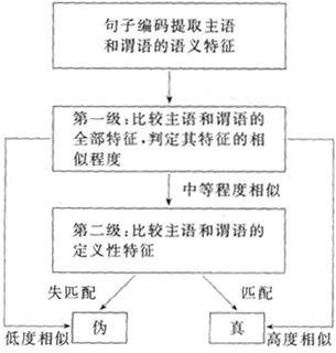 语义记忆理论模型。美国心理学家E.E.史密斯等人1974年提出。该模型假定,一个概念由一集语义特征来规定,这些特征描述了一个客体的属性。语义特征按其对概念的重要性,分为定义性特征和特异性特征两类。定义性特征对一个概念来说是本质的,是定义该概念所必需的特征。特异性特征对一个概念来说不是本质的,但有描述功能,使概念更具体化。如“鸟”这个概念的定义特征是动物、有羽毛;其特异性特征是体形小、会飞、捕食虫子等。该模型假定,这些语义特征预存在长时记忆中(图1),而两个概念之间的关系则是通过从预存的特征计算或推导出来的。两个概念之间共同的语义特征特别是定义性特征愈多,则联系愈紧密。特征比较模型对句子的加工是分两级进行的(图2)。当判断一个句子(如“麻雀是鸟”)的真伪时,首先执行第一级加工,即提取句子的主语和谓语两个概念的全部语义特征,包括定义性特征和特异性特征,并进行整体比较,确定两者特征的相似程度。若两个概念之间的特征的相似程度非常高或非常低,则可以作肯定或否定的反应。亦即,若两个概念的特征相似程度大于一个高标准(如“麻雀”与“鸟”),则可判定该句子为真;若小于一个低标准(如“麻雀”与“铅笔”),则判定该句子为伪。若两个句子之间特征的相似程度处于这两个标准之间(如“鸡”和“鸟”或“蝙蝠”和“鸟”),则需执行第二级加工。在第二级加工中,把主语和谓语具有的定义性特征分离出来,并加以比较。若两个概念所有的定义性特征彼此均匹配,则可判定该句子为真,否则即判定该句子为伪。这两级加工在性质上有所不同。第一级加工带有启发式性质,速度较快,但当许多相似特征不是定义性特征时,常会发生错误。第二级加工实际是一种计算过程,较少发生错误,但所需较长。特征比较模型的两级加工可解释判断不同句子所需反应时的差别以及典型性效应。