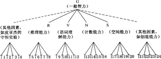 英国心理学家艾森克提出的智力结构模型。最初(1953年),他认为智力可以分为材料(词汇、数字、空间)、心理过程(推理、记忆、知觉)和品质(速度、质量)三个维度,它们分别与吉尔福特的内容、操作和产品相类似。在此基础上,20世纪70年代他从“智力是多种认识能力的总体”这一观念出发,提出一种智力的层次模型(如图所示)。该模型肯定了斯皮尔曼二因素论中G因素的存在,并把G看作一级,指人们在一切活动中都必需的基本能力,如感知觉、记忆、思维、想象等能力;把人们在从事某种专业活动中所必需的特殊能力,如推理(R)、语词理解(V)、计数(N)、空间知觉(S)等能力看作是二级;把与各种测验所测内容相应的特殊能力的具体表现看作是三级,如在解决数学问题时需要有理解数学符号间关系的能力、逻辑推理和概括能力以及运算的敏捷性等,这些都是计数能力的具体表现。