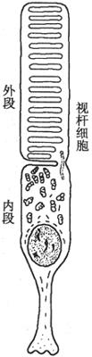 视觉暗光感受器。位于视网膜上,和视锥细胞一起组成眼底的感光结构。对光的敏感度高,特别是介于绿蓝色光之间的光,对单个光子有反应,适宜夜间活动。猫头鹰、鼠等夜行动物的视网膜中含量较多。视杆细胞对色光的分辨力甚差,也不具有视网膜精细的空间分辨功能。人的视杆细胞总数达1亿个以上,除中央凹处缺乏视杆细胞之外,愈向视网膜的边缘,分布得愈多。视杆细胞有内段和外段两个部分,内段包含细胞核、高尔基氏体、线粒体等细胞器,末端形成突触,在黑暗条件下,突触不断地释放递质;外段特化成许多(1000个~2000个)堆叠有序、相距仅为3纳米的膜盘(见图),膜内包含高浓度的感光蛋白——视紫红质。由于膜本身呈流体状,这使视紫红质分子能快速地转动、扩散,俘获从不同方向入射的光子。视紫红质吸收光后,通过细胞内的钙离子和环化乌苷酸(cGMP)等信使的活动,使膜上的离子通道关闭,导致钠离子通透性降低,使膜电位发生超级化,从而引起内段的突触释放递质量减少,借以传递信息。