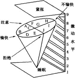情绪分类理论的一种。施洛斯贝格提出。该模式图把面部表情按其属性分为愉快-不愉快、注意-拒绝、睡眠-紧张(唤醒水平)三个维度。三个维度相对独立,在空间上各占一定位置(如图)。惊奇、喜爱、高兴、快乐、蔑视、恐惧、痛苦、愤怒、决心、厌恶等面部情绪表现被划归在一定的空间位置中,从而构成面部表情三维模式图。该模式图为情绪的多维量分类勾画出较清晰的轮廓,但难以把复杂的情绪内容全部包容和合理划分。