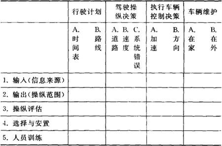 驾驶员承担的驾驶工作。分狭义与广义。狭义是指驾驶员对车辆的监控。现在已有一些数学模型,可用于对车辆的全自动操纵,减轻驾驶员的工作强度,增强驾驶的舒适性,使驾驶员处于主动地位。驾驶员控制车辆的方式受多种因素的影响,如可用的信息或线索、驾驶员的知觉能力及信息处理过程。有效驾驶依赖于驾驶员根据环境变化对各种因素的及时协调,实质是注意的分配问题。驾驶员分配到各个目标上的注意受外部环境需要和内部动机的影响,通常取决于道路环境。当环境需要增加时,驾驶员对驾驶的注意相应增加;当环境需要减少时,注意量也减少。可以通过减少环境需要来缓解驾驶疲劳。需要注意的是,由于现代商业迅速发展,道路环境变得复杂,如两旁高耸的广告牌、熙熙攘攘的行人、拥挤的车辆等,使驾驶员知觉新信息的时间增长,不利于安全驾驶。如何保证对驾驶的注意与环境需要相适应,就成为值得研究的问题。广义涉及与驾驶有关的所有方面。除对车辆的监控以外,运输系统中涉及人的因素还很多,如驾驶员必须为行车方向、路线、车型选择等作出决策。赫尔伯特和伯格1970年提供了一种分析人的驾驶功能及其特征的框架(见下表)。使用这种方法,有助于我们更好地理解人-机之间的交互作用。 对驾驶任务分配的分析